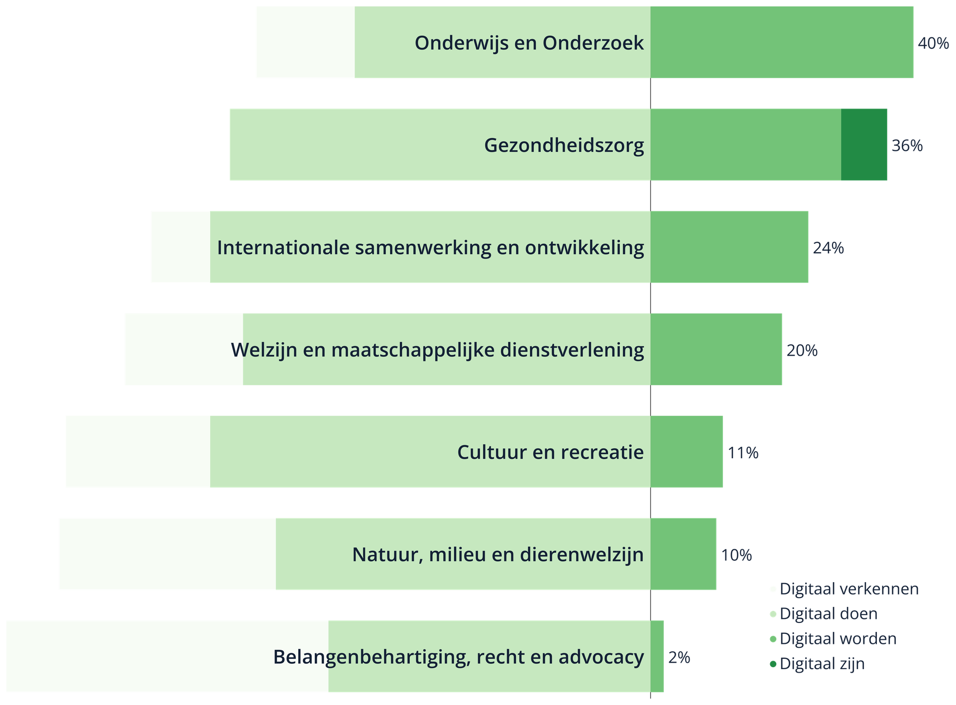 Onderwijs en gezondheidszorg springen eruit: respectievelijk 40% en 36% van de organisaties daar zitten in de fase “worden” of "zijn". Geen toeval, want die sectoren: