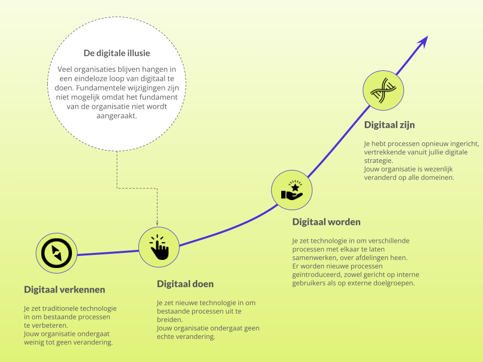 Veel organisaties blijven hangen in de fase van 'digitaal doen' in plaats van 'digitaal zijn'. Dit betekent dat ze technologie wel gebruiken, maar zonder een fundamentele verandering in hun processen en cultuur door te voeren. Dit leidt tot beperkte vooruitgang en suboptimale resultaten.