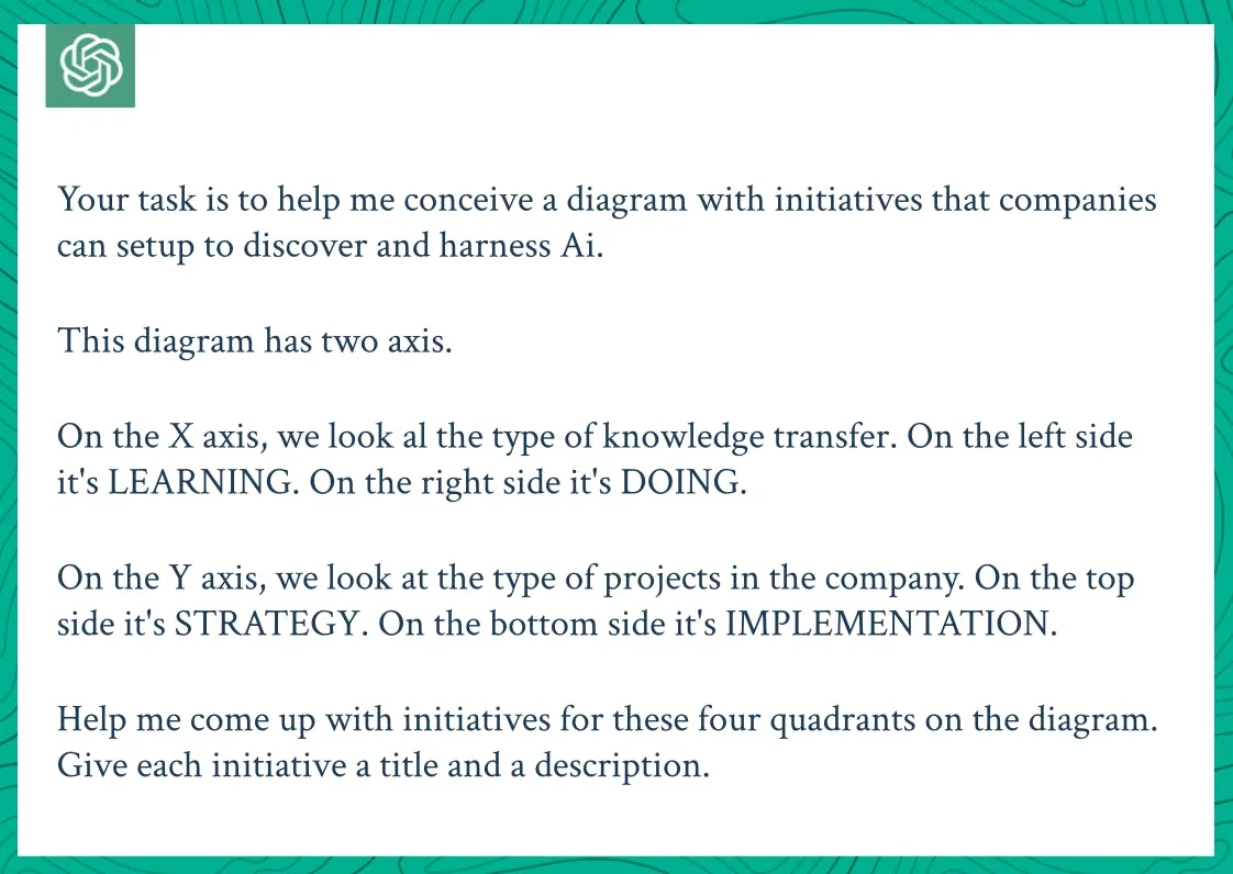 - Evalueer eerst eerdere AI-initiatieven van je team. Zo zie je of je team klaar is om samen een AI-actieplan te maken. Gebruik de ChatGPT-startprompt om snel te brainstormen over waar mogelijkheden liggen voor je organisatie.