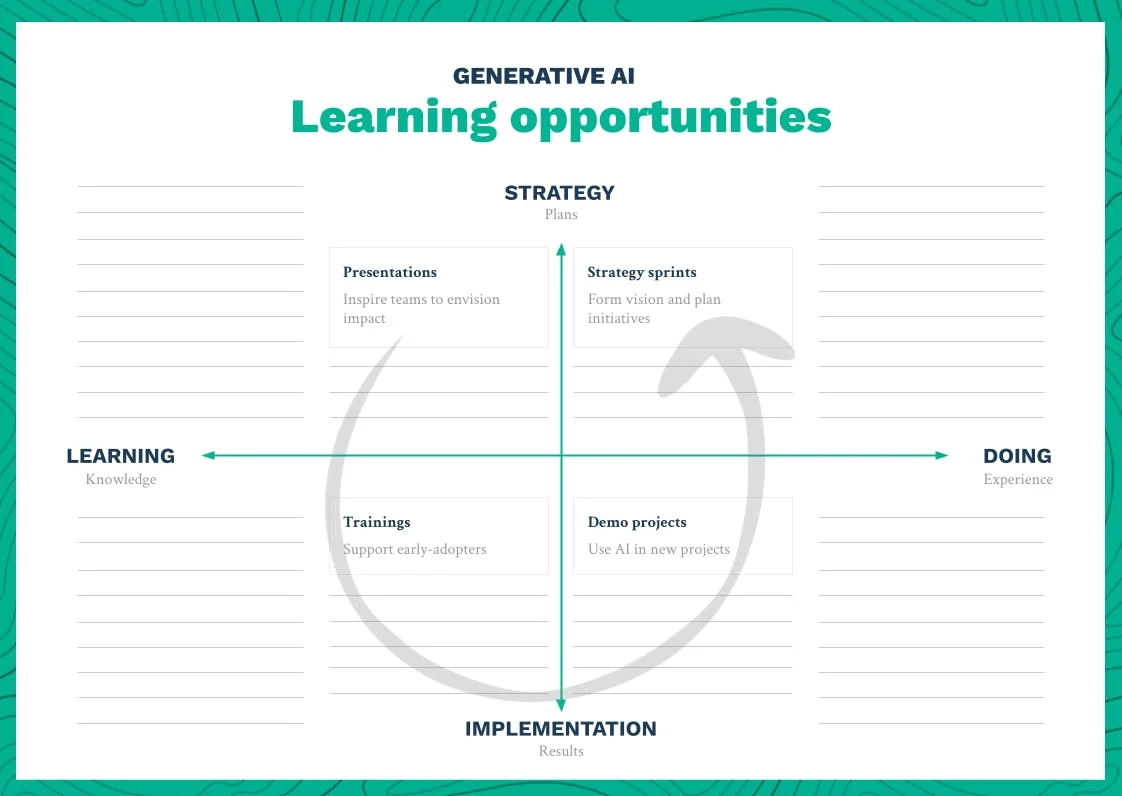 Nodig je team uit om ideeën te bedenken voor elk kwadrant. Bespreek eerst wat al is gedaan, zoals chatGPT-trainingen. Geef elk kwadrant 5-10 minuten.